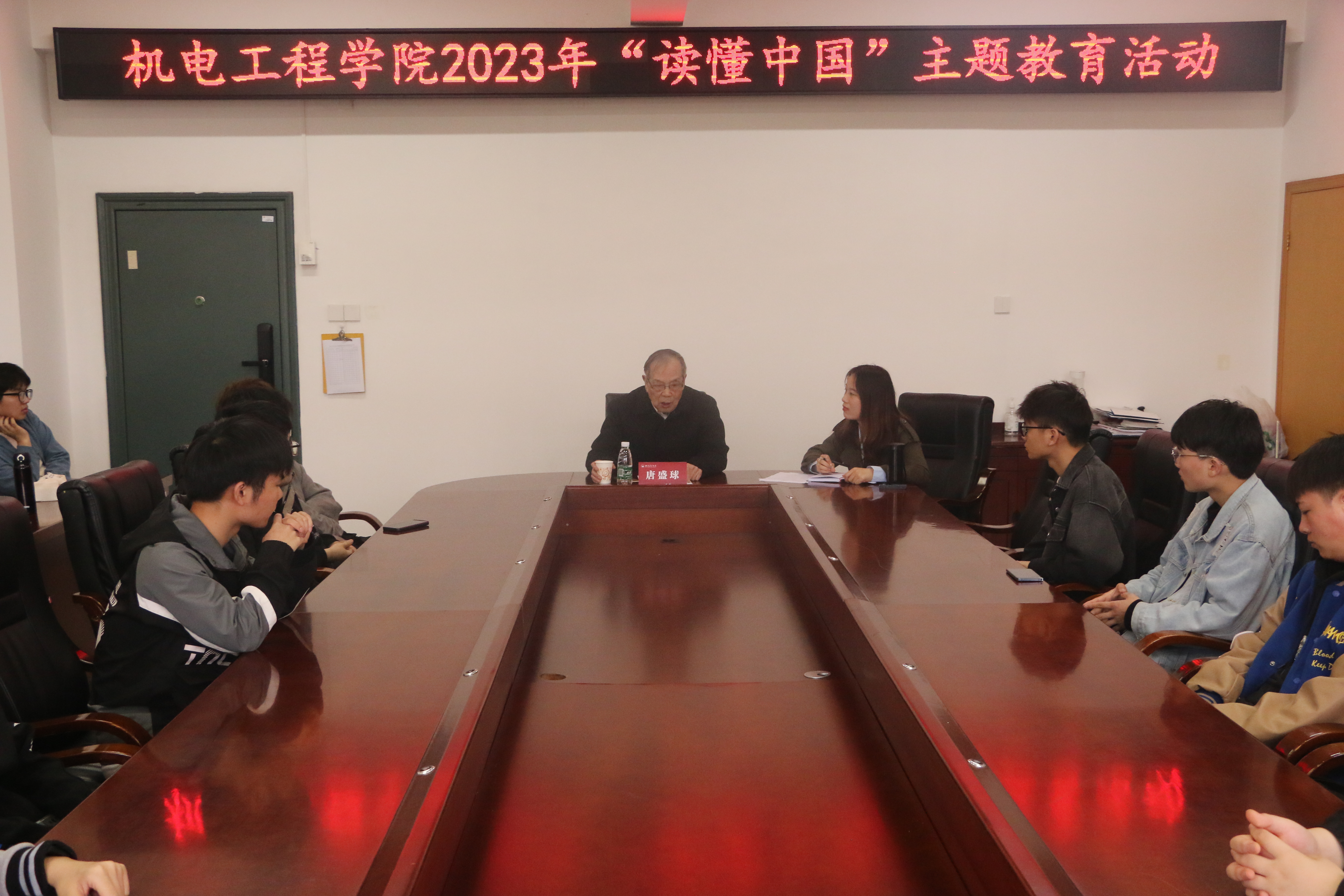 唐盛球与参会员工进行交流,和蔼耐心地为员工答疑解惑,他说道:“教书育人是需要教师付出一辈子心血的良心职业,我很开心我一辈子都在教育行业并为之奋斗。”最后,唐盛球结合自己的经验和理念,寄语机电学子:“当代青年要学会沉淀自我,抓住机遇,培养自己乐观的心态、辽阔的胸怀、长远的眼界,对国家、社会要有责任感,在时代新征程上立志做有理想、敢担当、能吃苦、肯奋斗的新时代好青年。”