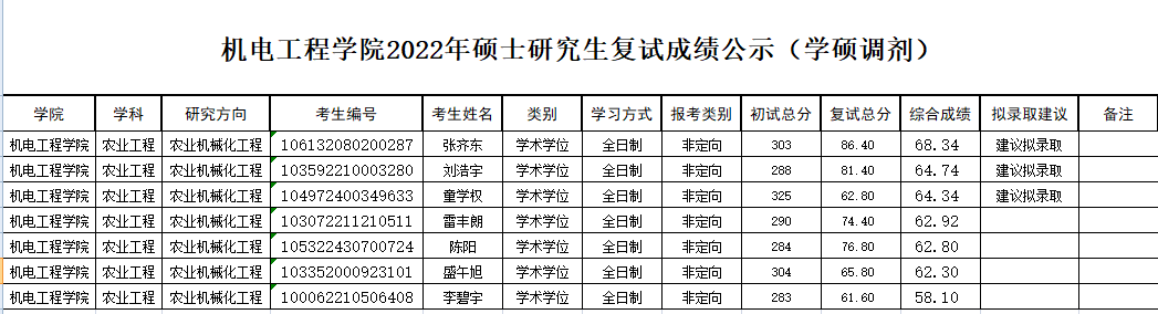 备注:综合成绩由初试成绩和复试成绩组成,其中初试成绩权重为70%,复试成绩权重为30%,综合成绩=初试成绩(折合成百分制)*70%+复试成绩*30%。