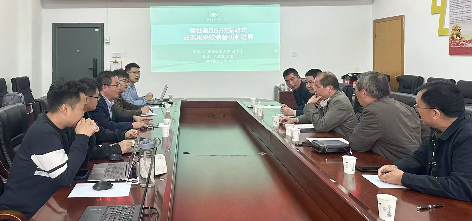 会议分为科研情况汇报和技术交流两个环节。在科研情况汇报阶段,唐乐为博士介绍了“柔性驱动分枝振动式油茶果采收装备”的研发情况,详细阐述了该装备的驱动、传动原理及样机研发流程,展示了该装备在油茶采收方面的特点、优势和创新性。随后全伟博士汇报了“苗盘回转式全自动移栽机”的研发进展,并分析了设计思路、研制过程、技术难点和产品优势。经理吴明亮教授对油茶果采收装备和全自动移栽机的产业化前景进行了深入分析。