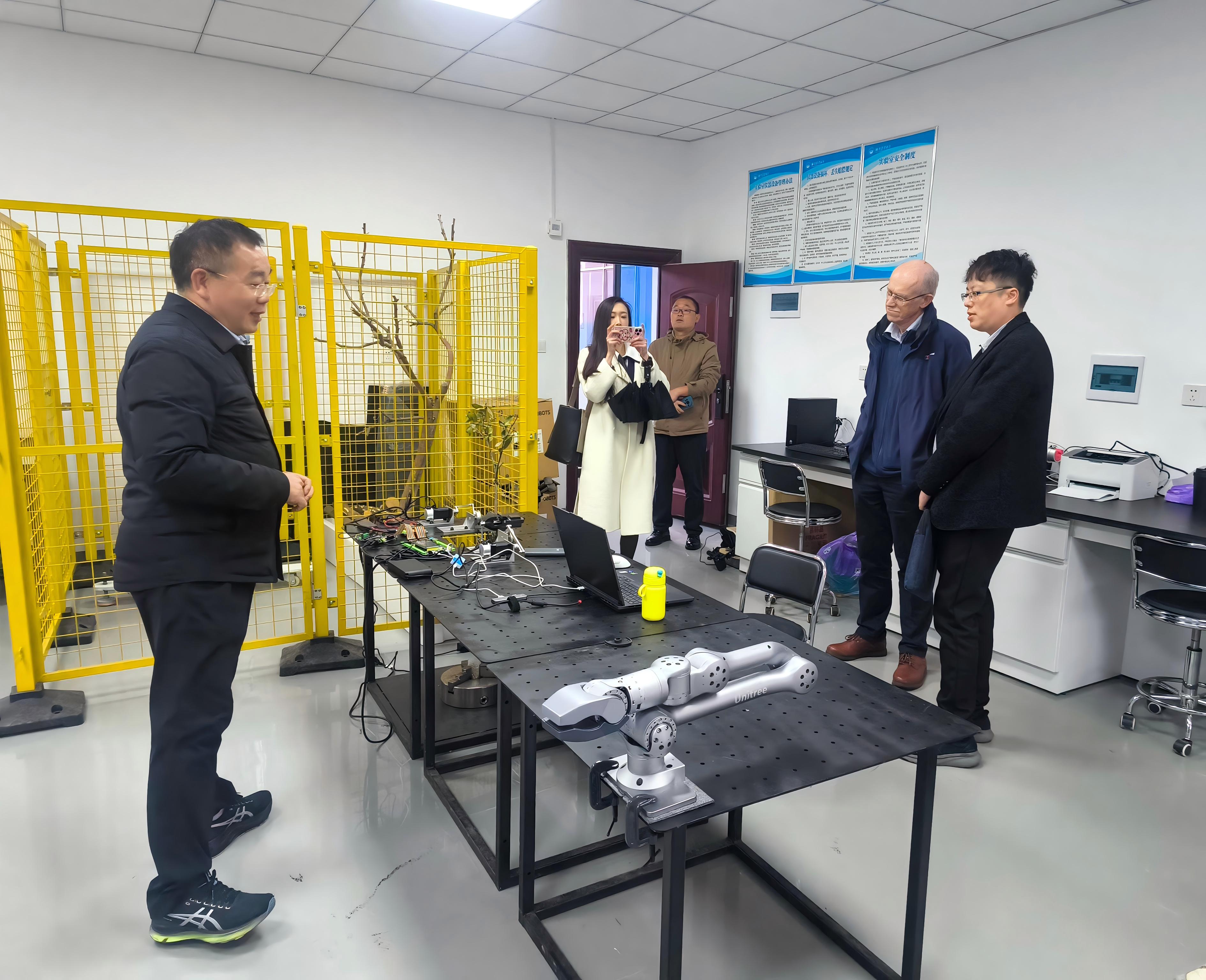 保罗·泰勒一行参观了公司国家水田机械质量检验检测中心试验基地、智能农机装备湖南省重点实验室以及室外展示的智能农机装备产品,吴明亮介绍了基地整体规划及各区域功能。观看了鲜辣椒巡检及采摘机器人现场作业表演。