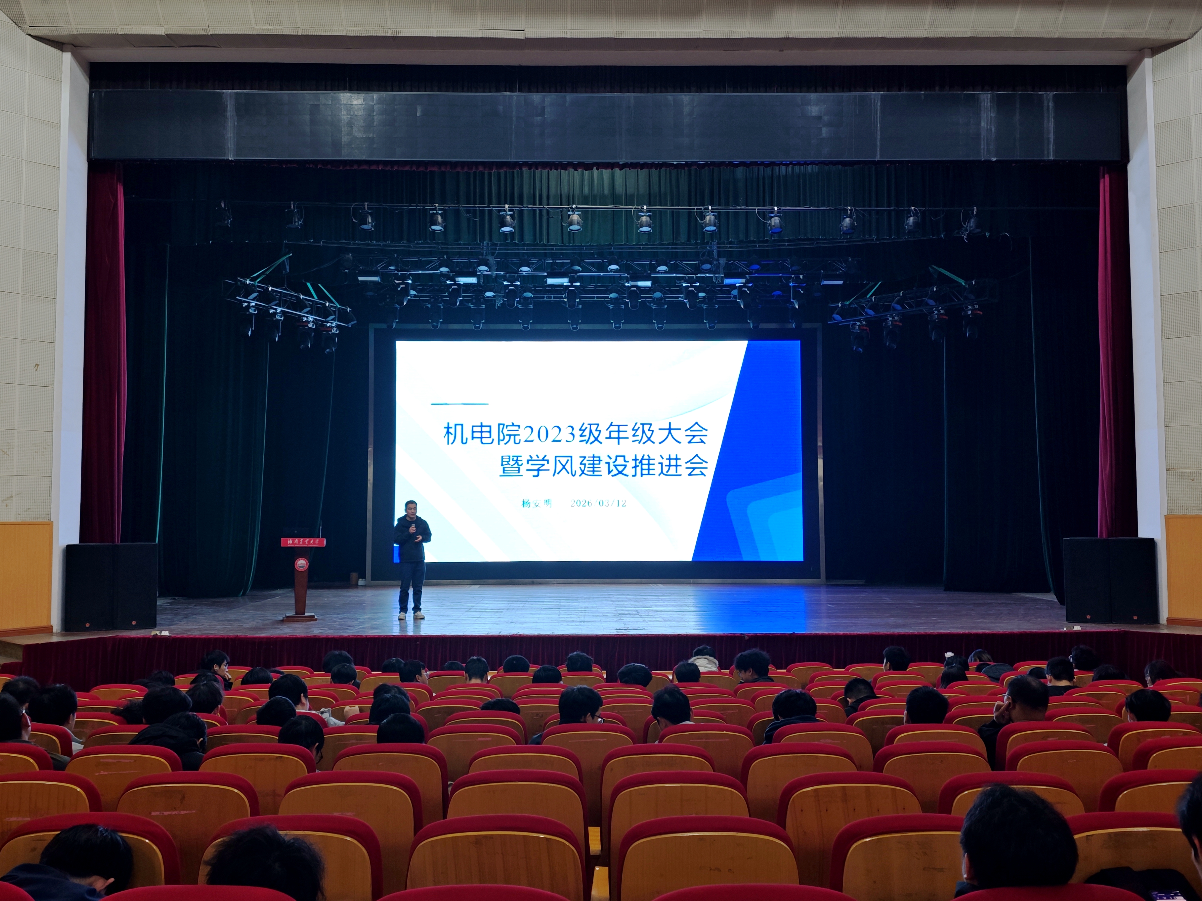本网讯(beat365手机版官网入口 傅鸿轩)为明确新学期学习任务、规划学业发展方向、强化学风建设,3月12日中午,公司2023级年级大会暨学风建设推进会在公司大礼堂举行。大会由2023级辅导员杨安明老师主持,全体2023级员工参会,为新学期学习生活锚定方向、凝聚力量。